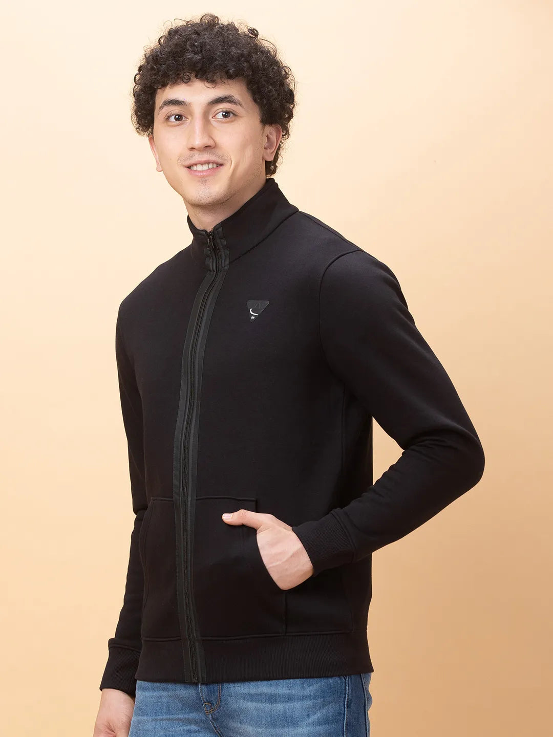 Stay warm and stylish in this black zip-front sweatshirt. The high neck and solid pattern make it perfect for casual outings. Its regular fit provides comfort and ease of movement.